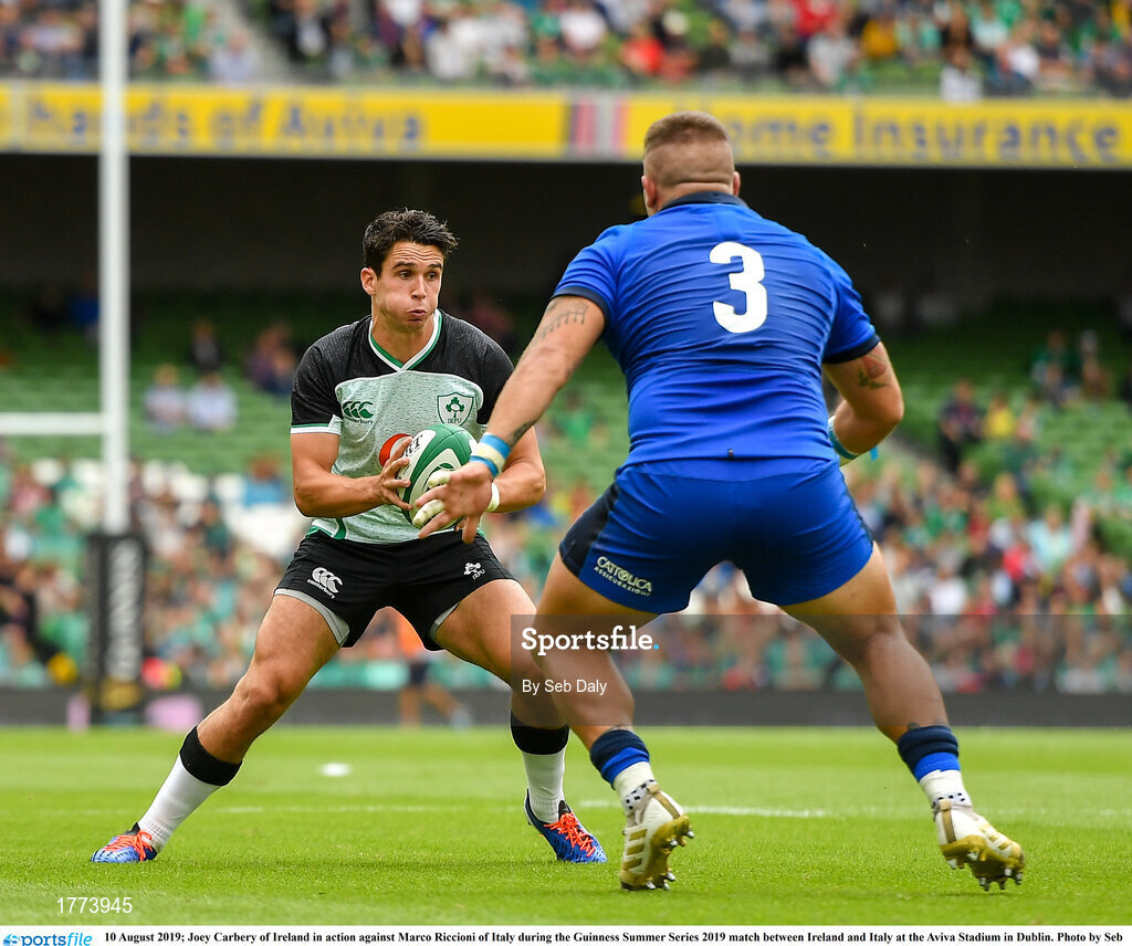 10 August 2019; Joey Carbery of Ireland in action against Marco Riccioni of Italy during the Guinness Summer Series 2019 match between Ireland and Italy at the Aviva Stadium in Dublin. Photo by Seb Daly/Sportsfile