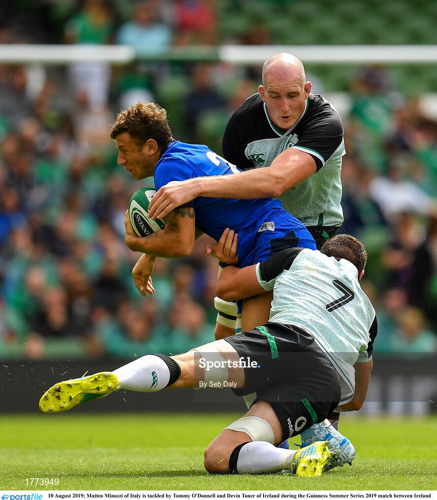 10 August 2019; Matteo Minozzi of Italy is tackled by Tommy O'Donnell and Devin Toner of Ireland during the Guinness Summer Series 2019 match between Ireland and Italy at the Aviva Stadium in Dublin. Photo by Seb Daly/Sportsfile