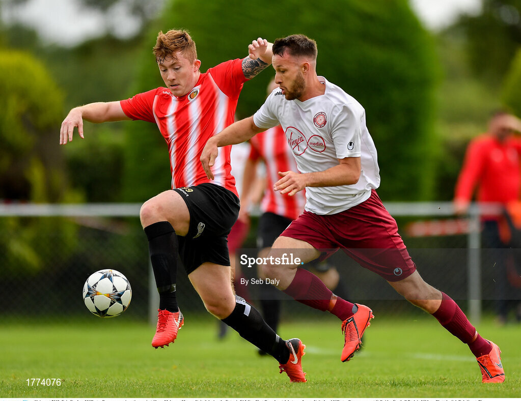 11 August 2019; Eoin Fowler of Killester Donnycarney in action against Shane Moloney of Lucan United during the Extra.ie FAI Cup First Round match between Lucan United and Killester Donnycarney at Celbridge Football Park in Kildare. Photo by Seb Daly/Sportsfile