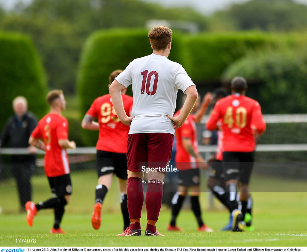 11 August 2019; John Brophy of Killester Donnycarney reacts after his side concede a goal during the Extra.ie FAI Cup First Round match between Lucan United and Killester Donnycarney at Celbridge Football Park in Kildare. Photo by Seb Daly/Sportsfile