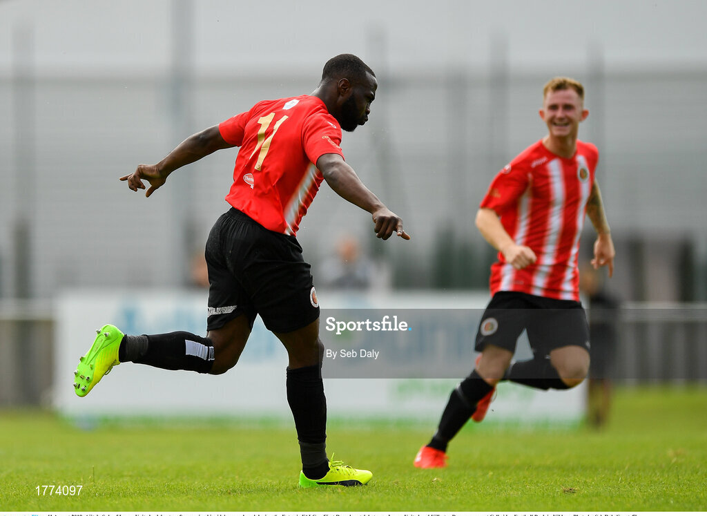 11 August 2019; Ajitola Sule of Lucan United celebrates after scoring his side's second goal during the Extra.ie FAI Cup First Round match between Lucan United and Killester Donnycarney at Celbridge Football Park in Kildare. Photo by Seb Daly/Sportsfile
