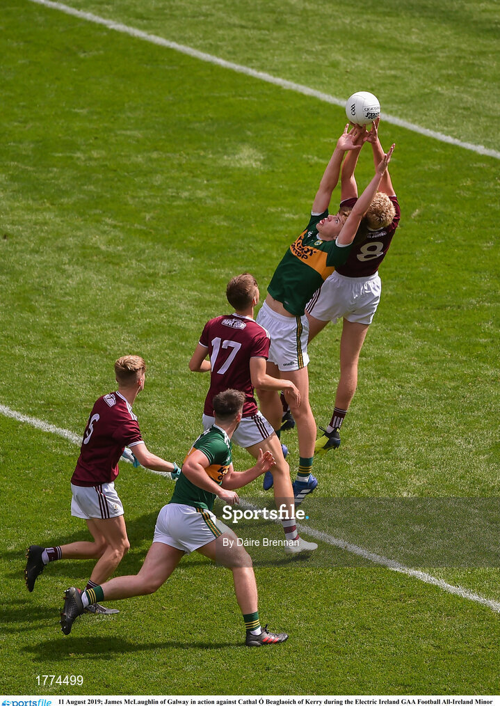 11 August 2019; James McLaughlin of Galway in action against Cathal Ó Beaglaoich of Kerry during the Electric Ireland GAA Football All-Ireland Minor Championship Semi-Final match between Kerry and Galway at Croke Park in Dublin. Photo by Daire Brennan/Sportsfile