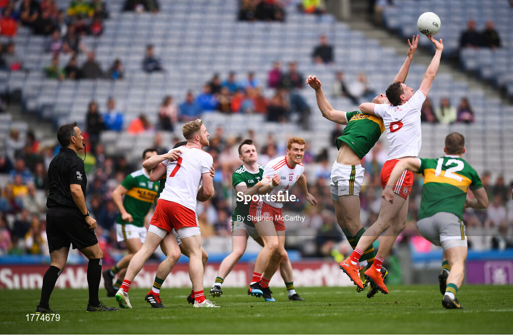 11 August 2019; Colm Cavanagh of Tyrone in action against David Moran of Kerry during the GAA Football All-Ireland Senior Championship Semi-Final match between Kerry and Tyrone at Croke Park in Dublin. Photo by Stephen McCarthy/Sportsfile