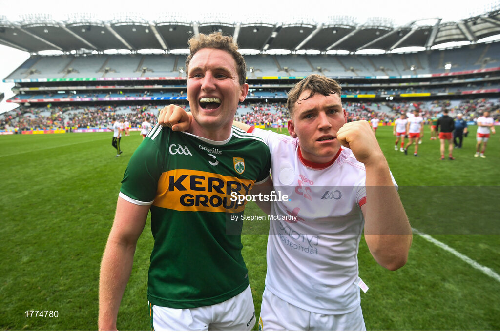 11 August 2019; Tadhg Morley, left, and Dara Moynihan of Kerry celebrate following the GAA Football All-Ireland Senior Championship Semi-Final match between Kerry and Tyrone at Croke Park in Dublin. Photo by Stephen McCarthy/Sportsfile