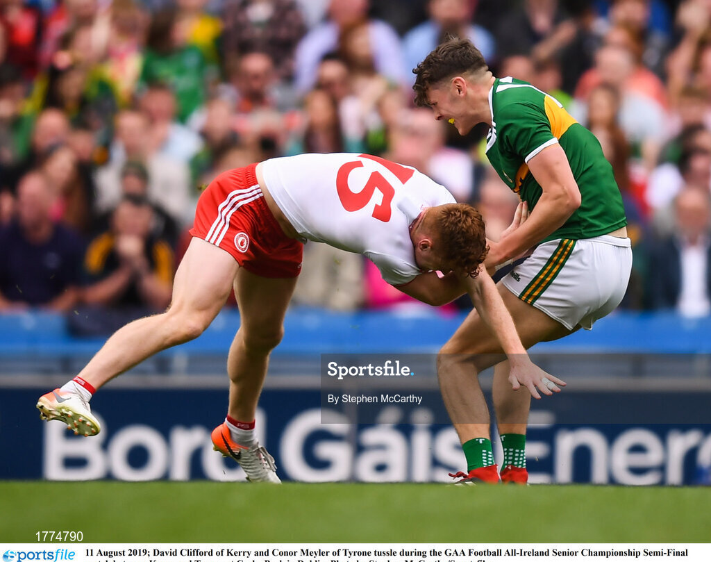 11 August 2019; David Clifford of Kerry and Conor Meyler of Tyrone tussle during the GAA Football All-Ireland Senior Championship Semi-Final match between Kerry and Tyrone at Croke Park in Dublin. Photo by Stephen McCarthy/Sportsfile