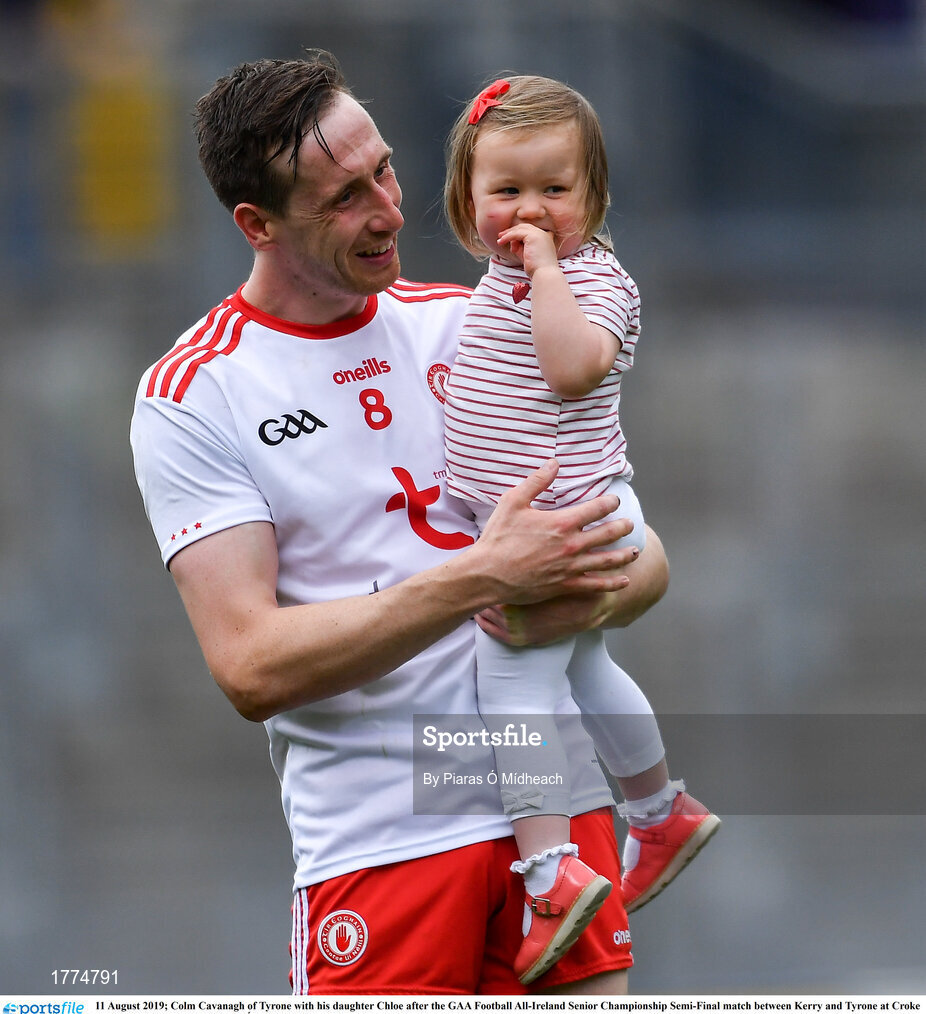 11 August 2019; Colm Cavanagh of Tyrone with his daughter Chloe after the GAA Football All-Ireland Senior Championship Semi-Final match between Kerry and Tyrone at Croke Park in Dublin. Photo by Piaras Ó Mídheach/Sportsfile
