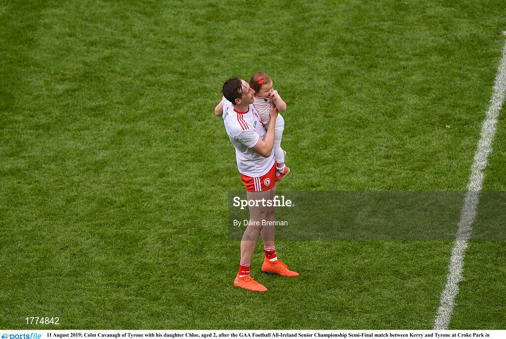11 August 2019; Colm Cavanagh of Tyrone with his daughter Chloe, aged 2, after the GAA Football All-Ireland Senior Championship Semi-Final match between Kerry and Tyrone at Croke Park in Dublin. Photo by Daire Brennan/Sportsfile