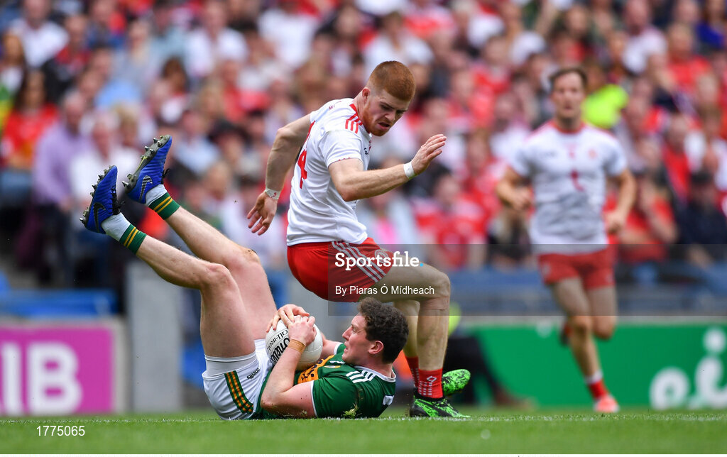 11 August 2019; Tadhg Morley of Kerry in action against Cathal McShane of Tyrone during the GAA Football All-Ireland Senior Championship Semi-Final match between Kerry and Tyrone at Croke Park in Dublin. Photo by Piaras Ó Mídheach/Sportsfile