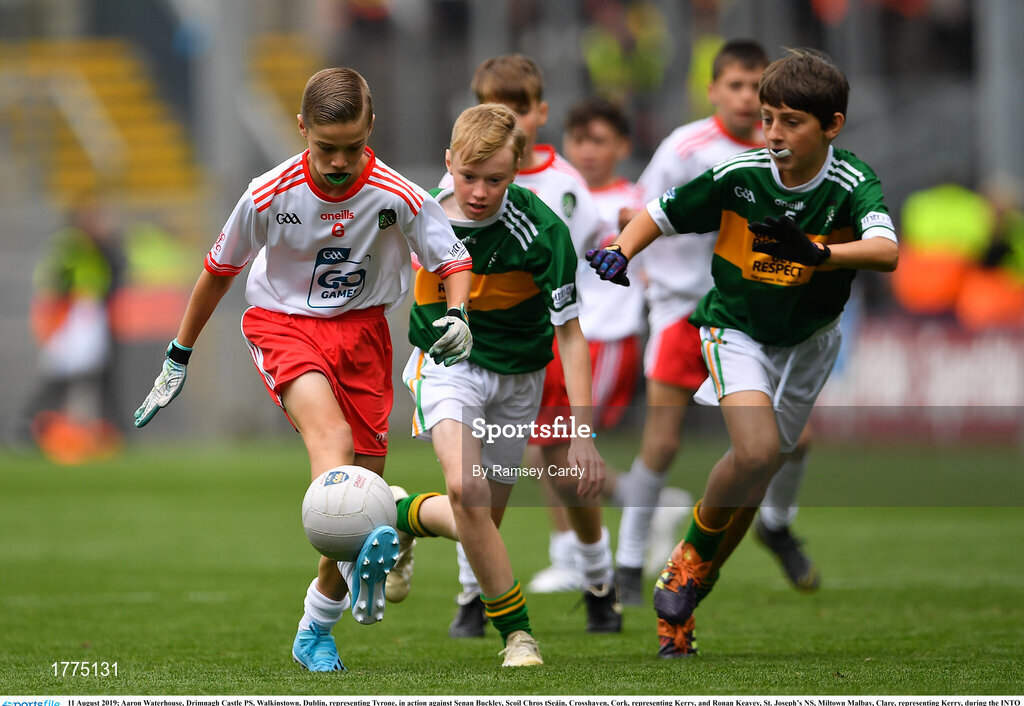 11 August 2019; Aaron Waterhouse, Drimnagh Castle PS, Walkinstown, Dublin, representing Tyrone, in action against Senan Buckley, Scoil Chros tSeáin, Crosshaven, Cork, representing Kerry, and Ronan Keavey, St. Joseph’s NS, Miltown Malbay, Clare, representing Kerry, during the INTO Cumann na mBunscol GAA Respect Exhibition Go Games during the GAA Football All-Ireland Senior Championship Semi-Final match between Kerry and Tyrone at Croke Park in Dublin. Photo by Ramsey Cardy/Sportsfile