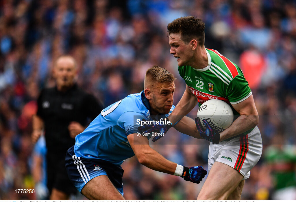 10 August 2019; Matthew Ruane of Mayo in action against Jonny Cooper of Dublin during the GAA Football All-Ireland Senior Championship Semi-Final match between Dublin and Mayo at Croke Park in Dublin. Photo by Sam Barnes/Sportsfile