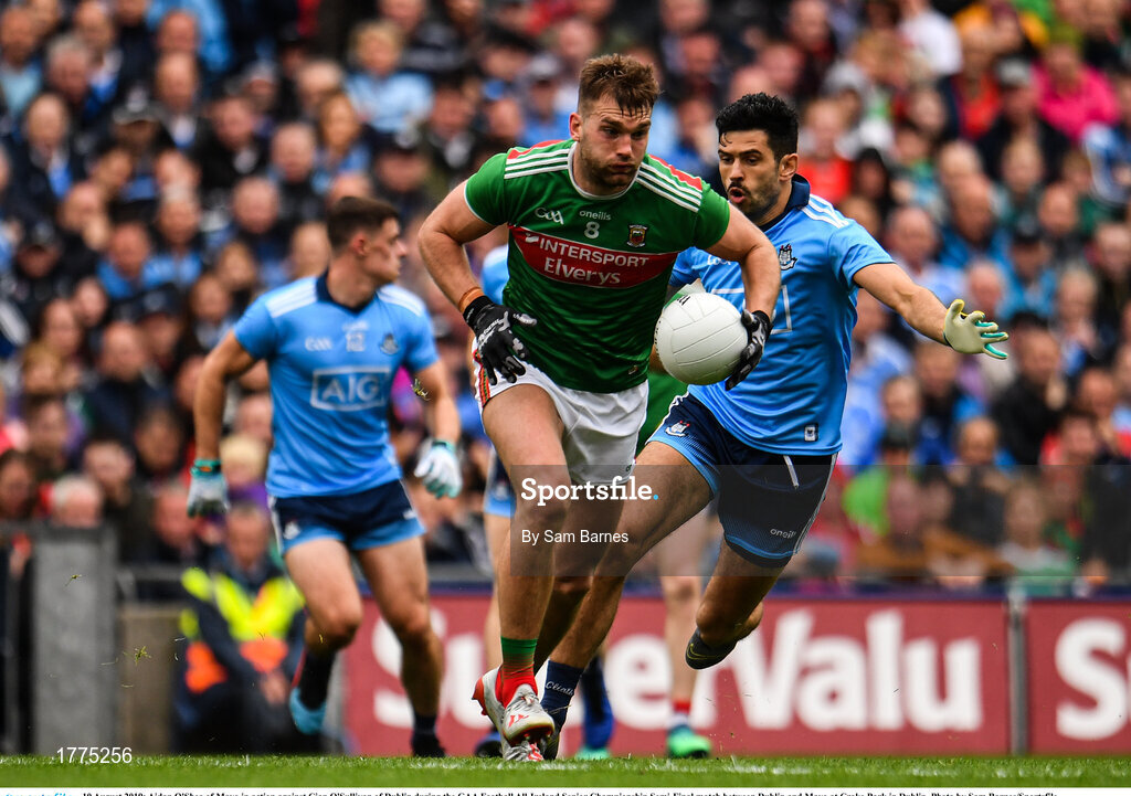 10 August 2019; Aidan O'Shea of Mayo in action against Cian O'Sullivan of Dublin during the GAA Football All-Ireland Senior Championship Semi-Final match between Dublin and Mayo at Croke Park in Dublin. Photo by Sam Barnes/Sportsfile
