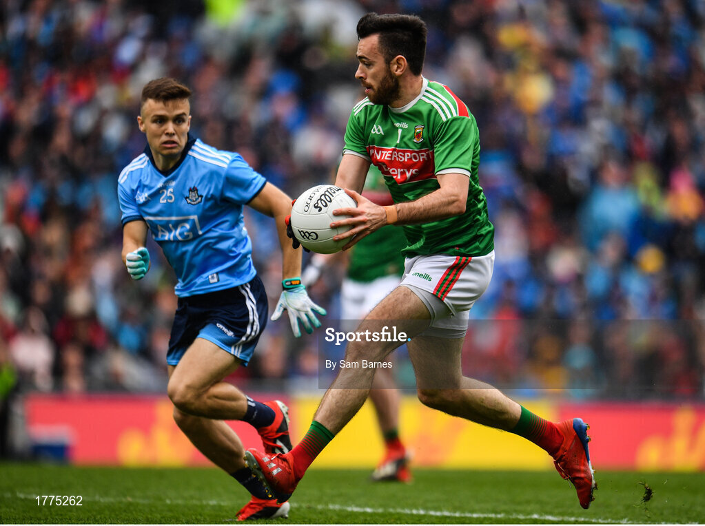 10 August 2019; Kevin McLoughlin of Mayo in action against Eoin Murchan of Dublin during the GAA Football All-Ireland Senior Championship Semi-Final match between Dublin and Mayo at Croke Park in Dublin. Photo by Sam Barnes/Sportsfile