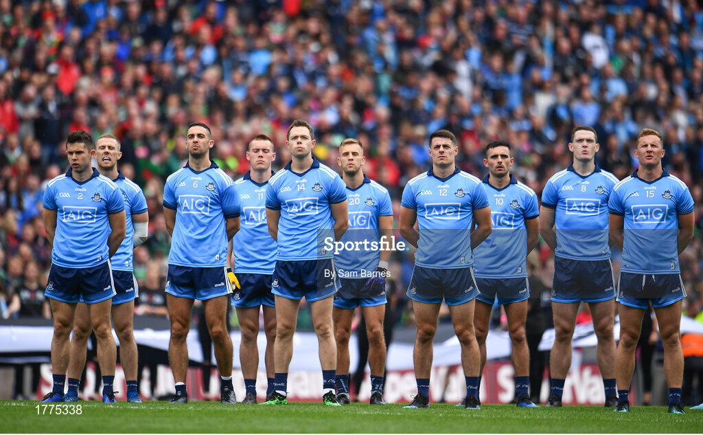 10 August 2019; Dublin players stand for the national anthem ahead of the GAA Football All-Ireland Senior Championship Semi-Final match between Dublin and Mayo at Croke Park in Dublin. Photo by Sam Barnes/Sportsfile