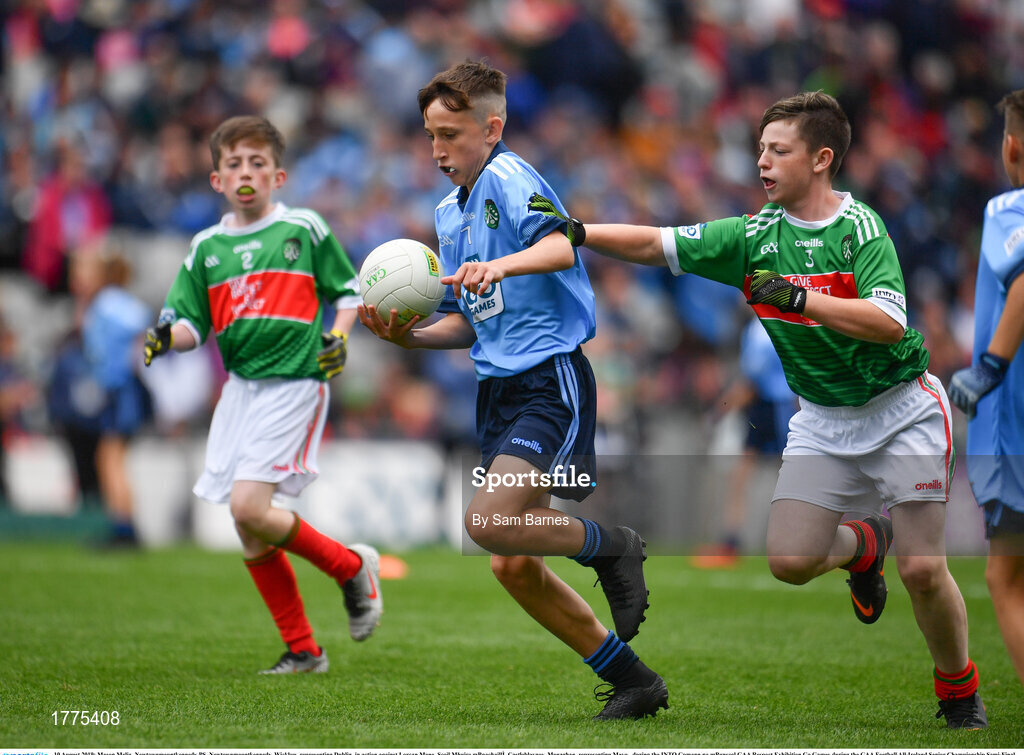 10 August 2019; Mason Melia, Newtownmountkennedy PS, Newtownmountkennedy, Wicklow, representing Dublin, in action against Lorcan Mone, Scoil Mhuire mBuachaillÌ ,Castleblayney, Monaghan, representing Mayo, during the INTO Cumann na mBunscol GAA Respect Exhibition Go Games during the GAA Football All-Ireland Senior Championship Semi-Final match between Dublin and Mayo at Croke Park in Dublin. Photo by Sam Barnes/Sportsfile