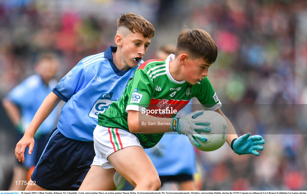 10 August 2019; Cillian Twohig, Kilmeen NS, Clonakilty ,Cork, representing Mayo, in action against Mason Melia, Newtownmountkennedy PS, Newtownmountkennedy, Wicklow, representing Dublin, during the INTO Cumann na mBunscol GAA Respect Exhibition Go Games during the GAA Football All-Ireland Senior Championship Semi-Final match between Dublin and Mayo at Croke Park in Dublin. Photo by Sam Barnes/Sportsfile