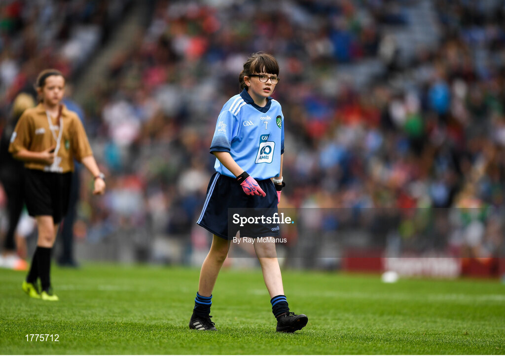 10 August 2019; Matilda McDaid, St Mary’s PS, Newtownbutler, Fermanagh, representing Dublin, during the INTO Cumann na mBunscol GAA Respect Exhibition Go Games during the GAA Football All-Ireland Senior Championship Semi-Final match between Dublin and Mayo at Croke Park in Dublin. Photo by Ray McManus/Sportsfile