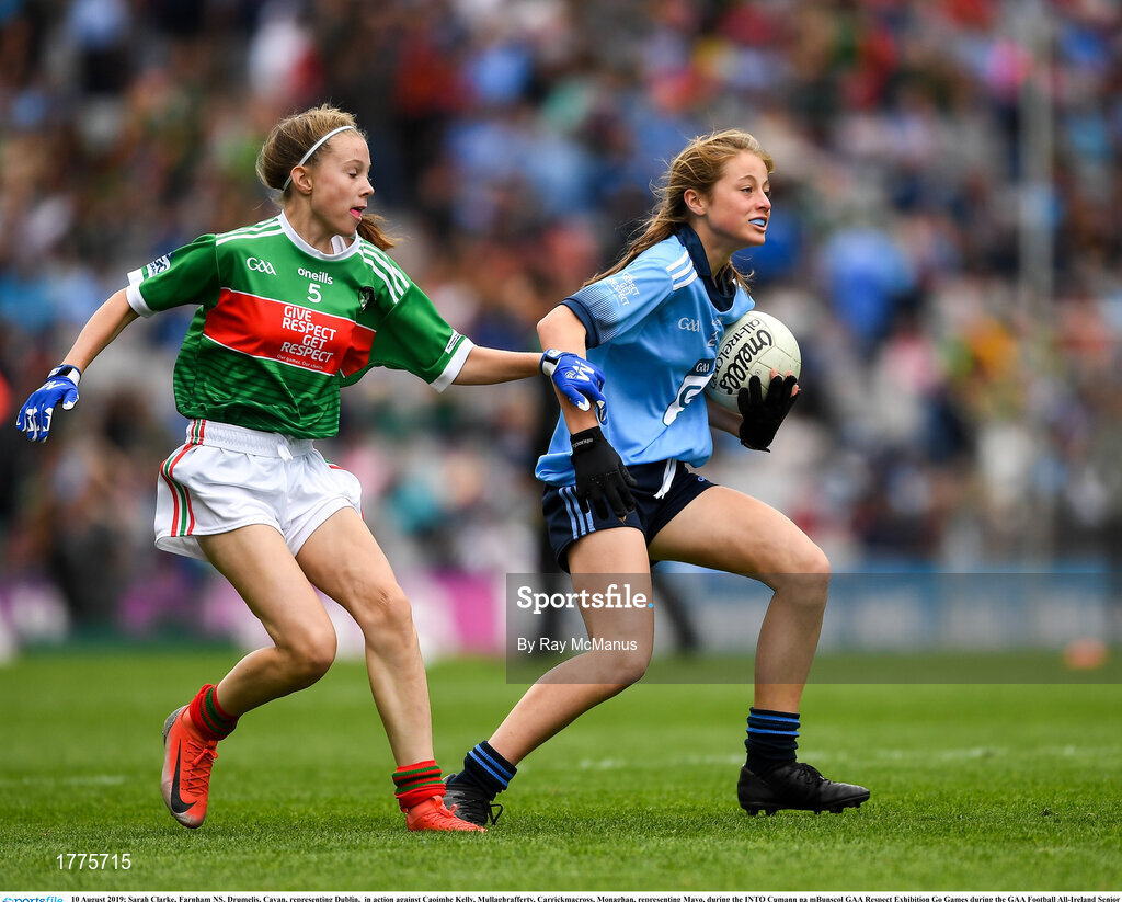 10 August 2019; Sarah Clarke, Farnham NS. Drumelis, Cavan, representing Dublin, in action against Caoimhe Kelly, Mullaghrafferty, Carrickmacross, Monaghan, representing Mayo, during the INTO Cumann na mBunscol GAA Respect Exhibition Go Games during the GAA Football All-Ireland Senior Championship Semi-Final match between Dublin and Mayo at Croke Park in Dublin. Photo by Ray McManus/Sportsfile
