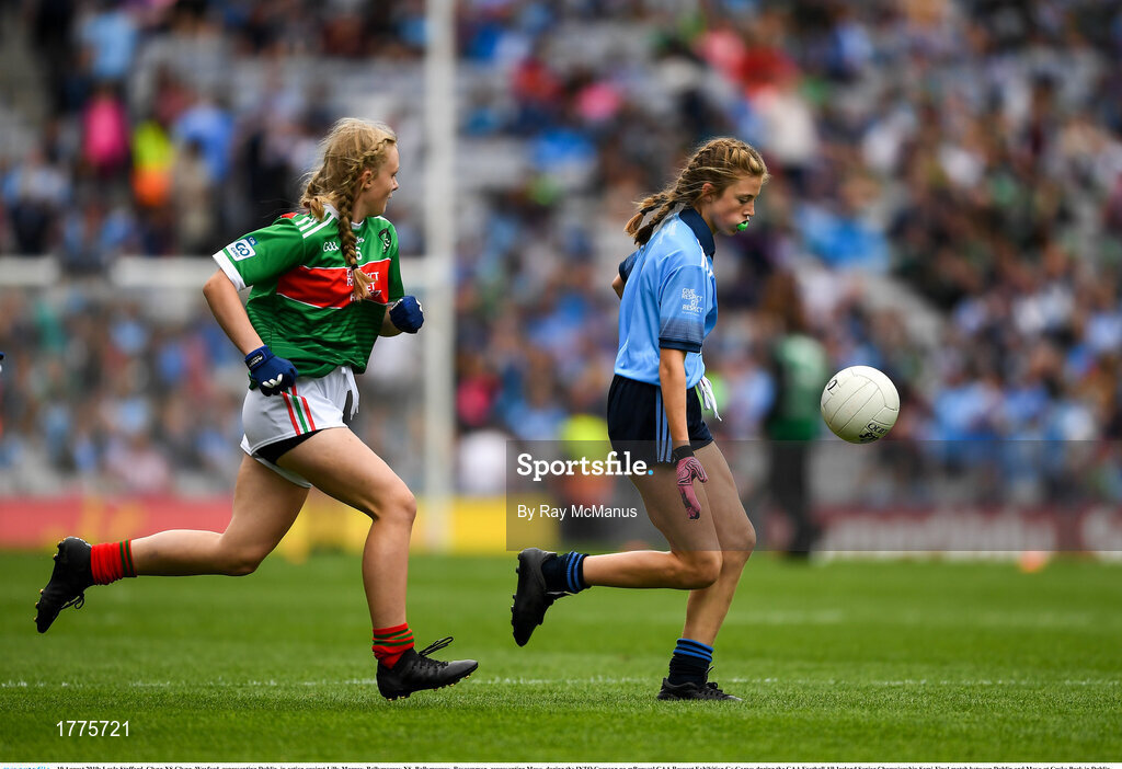10 August 2019; Layla Stafford, Glynn NS Glynn, Wexford, representing Dublin, in action against Lilly Murray, Ballymurray NS, Ballymurray, Roscommon, representing Mayo, during the INTO Cumann na mBunscol GAA Respect Exhibition Go Games during the GAA Football All-Ireland Senior Championship Semi-Final match between Dublin and Mayo at Croke Park in Dublin. Photo by Ray McManus/Sportsfile