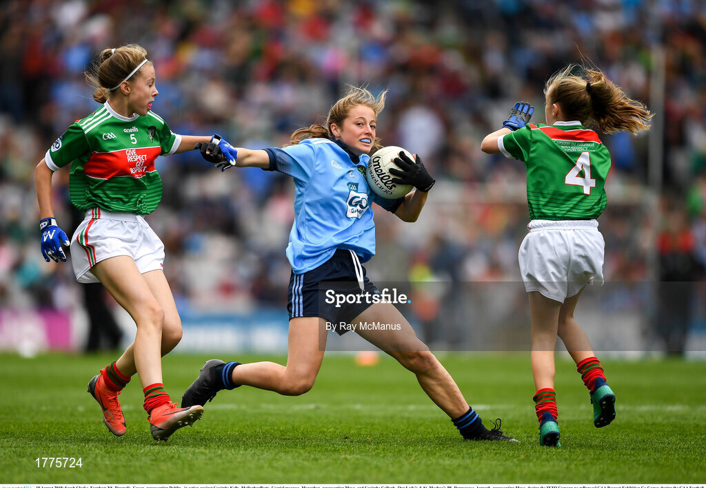 10 August 2019; Sarah Clarke, Farnham NS. Drumelis, Cavan, representing Dublin, in action against Caoimhe Kelly, Mullaghrafferty, Carrickmacross, Monaghan, representing Mayo, and Caoimhe Gollogly, Our Lady’s & St. Mochua’s PS, Derrynoose, Armagh, representing Mayo, during the INTO Cumann na mBunscol GAA Respect Exhibition Go Games during the GAA Football All-Ireland Senior Championship Semi-Final match between Dublin and Mayo at Croke Park in Dublin. Photo by Ray McManus/Sportsfile