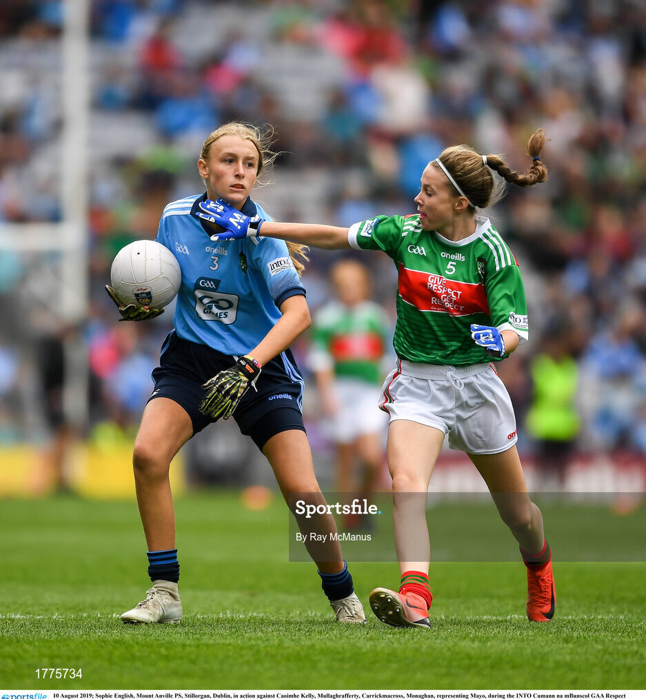 10 August 2019; Sophie English, Mount Anville PS, Stillorgan, Dublin, in action against Caoimhe Kelly, Mullaghrafferty, Carrickmacross, Monaghan, representing Mayo, during the INTO Cumann na mBunscol GAA Respect Exhibition Go Games during the GAA Football All-Ireland Senior Championship Semi-Final match between Dublin and Mayo at Croke Park in Dublin. Photo by Ray McManus/Sportsfile