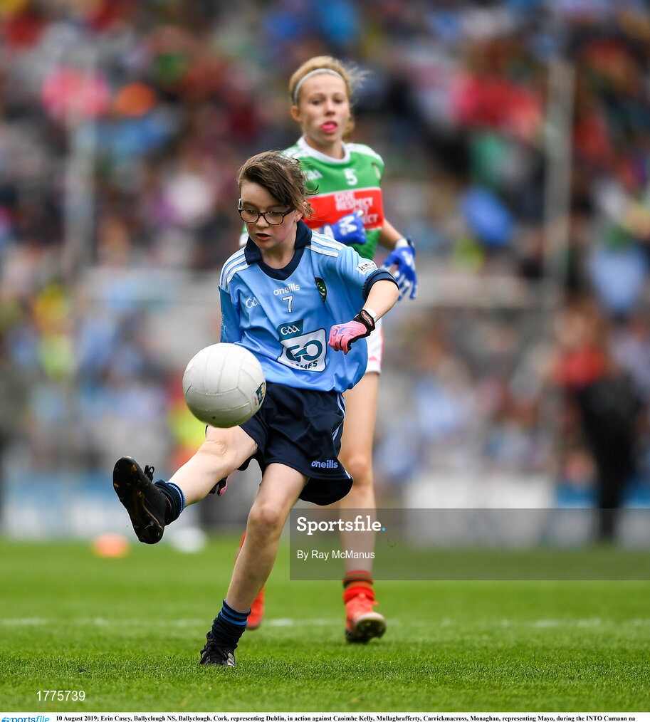10 August 2019; Erin Casey, Ballyclough NS, Ballyclough, Cork, representing Dublin, in action against Caoimhe Kelly, Mullaghrafferty, Carrickmacross, Monaghan, representing Mayo, during the INTO Cumann na mBunscol GAA Respect Exhibition Go Games during the GAA Football All-Ireland Senior Championship Semi-Final match between Dublin and Mayo at Croke Park in Dublin. Photo by Ray McManus/Sportsfile