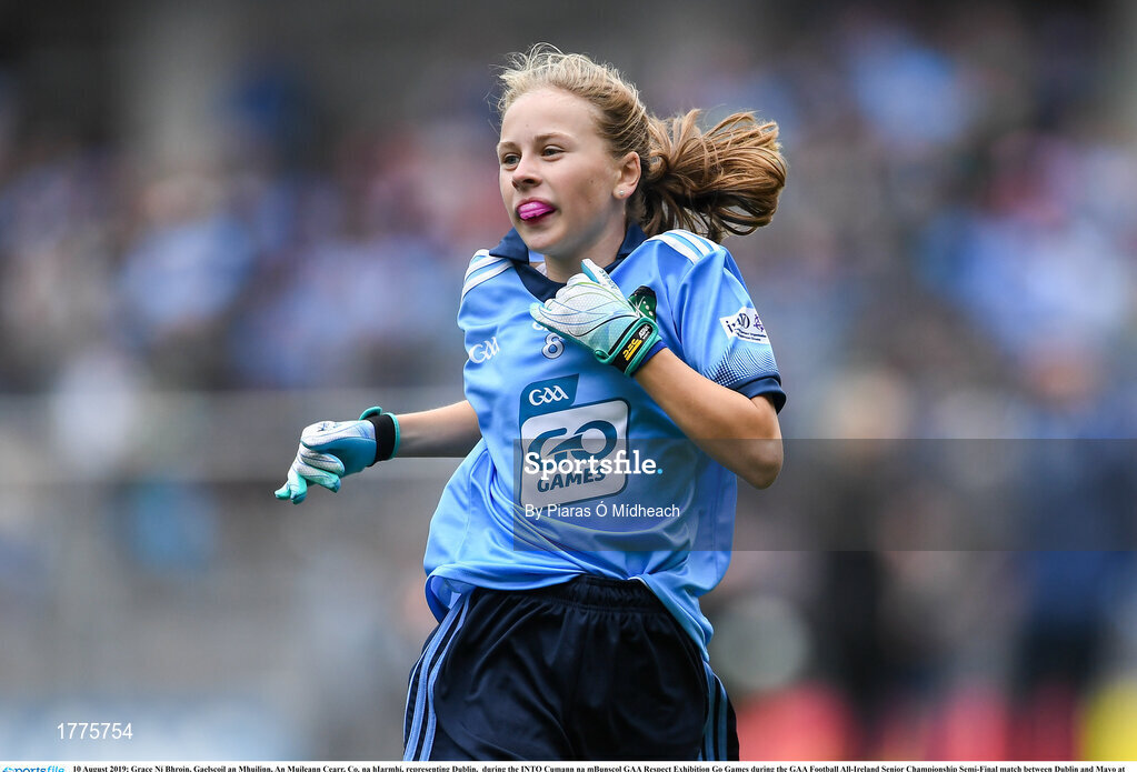 10 August 2019; Grace Ní Bhroin, Gaelscoil an Mhuilinn, An Muileann Cearr, Co. na hIarmhí, representing Dublin, during the INTO Cumann na mBunscol GAA Respect Exhibition Go Games during the GAA Football All-Ireland Senior Championship Semi-Final match between Dublin and Mayo at Croke Park in Dublin. Photo by Piaras Ó Mídheach/Sportsfile