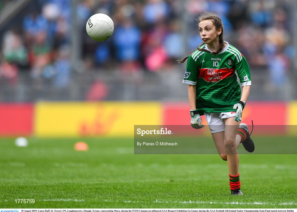 10 August 2019; Laura Duff, St. Teresa’s PS, Loughmacrory, Omagh, Tyrone, representing Mayo, during the INTO Cumann na mBunscol GAA Respect Exhibition Go Games during the GAA Football All-Ireland Senior Championship Semi-Final match between Dublin and Mayo at Croke Park in Dublin. Photo by Piaras Ó Mídheach/Sportsfile