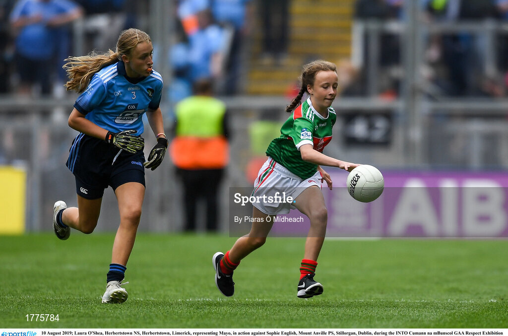 10 August 2019; Laura O'Shea, Herbertstown NS, Herbertstown, Limerick, representing Mayo, in action against Sophie English, Mount Anville PS, Stillorgan, Dublin, during the INTO Cumann na mBunscol GAA Respect Exhibition Go Games during the GAA Football All-Ireland Senior Championship Semi-Final match between Dublin and Mayo at Croke Park in Dublin. Photo by Piaras Ó Mídheach/Sportsfile