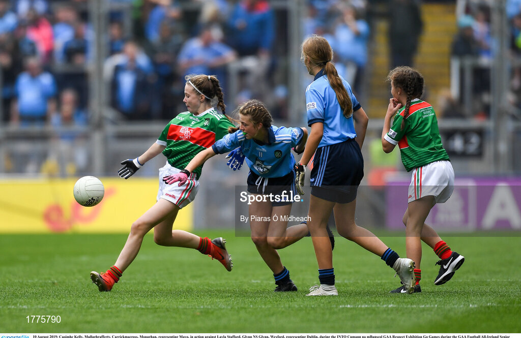 10 August 2019; Caoimhe Kelly, Mullaghrafferty, Carrickmacross, Monaghan, representing Mayo, in action against Layla Stafford, Glynn NS Glynn, Wexford, representing Dublin, during the INTO Cumann na mBunscol GAA Respect Exhibition Go Games during the GAA Football All-Ireland Senior Championship Semi-Final match between Dublin and Mayo at Croke Park in Dublin. Photo by Piaras Ó Mídheach/Sportsfile