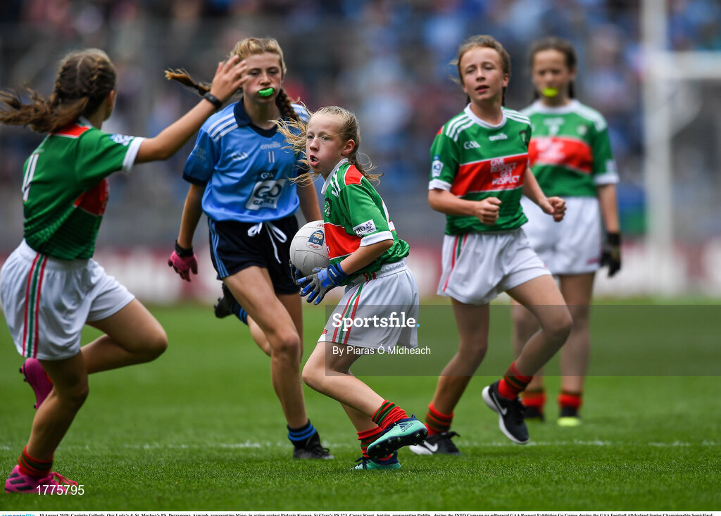 10 August 2019; Caoimhe Gollogly, Our Lady’s & St. Mochua’s PS, Derrynoose, Armagh, representing Mayo, in action against Pádraig Keenan, St Clare’s PS 323, Cupar Street, Antrim, representing Dublin, during the INTO Cumann na mBunscol GAA Respect Exhibition Go Games during the GAA Football All-Ireland Senior Championship Semi-Final match between Dublin and Mayo at Croke Park in Dublin. Photo by Piaras Ó Mídheach/Sportsfile