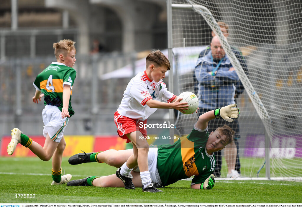 11 August 2019; Daniel Carr, St Patrick’s, Mayobridge, Newry, Down, representing Tyrone, and Jake Heffernan, Scoil Bhríde Dubh, Áth Duagh, Kerry, representing Kerry, during the INTO Cumann na mBunscol GAA Respect Exhibition Go Games at half-time of the GAA Football All-Ireland Senior Championship Semi-Final match between Kerry and Tyrone at Croke Park in Dublin. Photo by Stephen McCarthy/Sportsfile