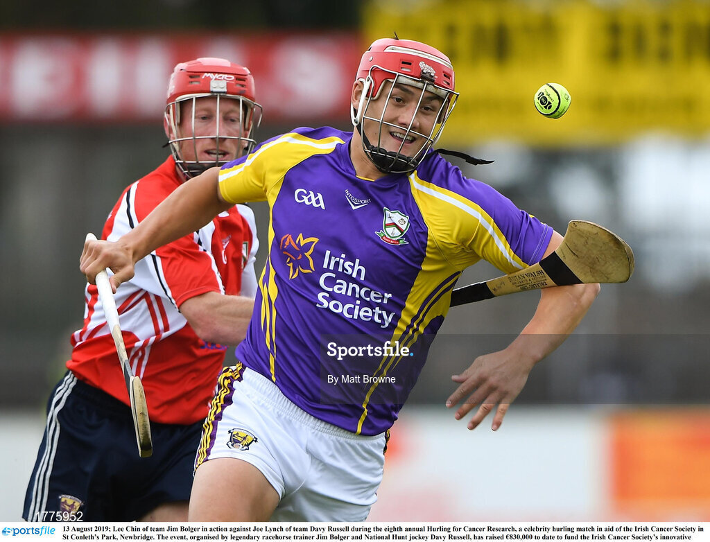 13 August 2019; Lee Chin of team Jim Bolger in action against Joe Lynch of team Davy Russell during the eighth annual Hurling for Cancer Research, a celebrity hurling match in aid of the Irish Cancer Society in St Conleth’s Park, Newbridge. The event, organised by legendary racehorse trainer Jim Bolger and National Hunt jockey Davy Russell, has raised €830,000 to date to fund the Irish Cancer Society’s innovative cancer research projects. The final score was: Jim Bolger’s Best: 15, Davy Russell’s Stars 15. St Conleth’s Park, Newbridge, Co Kildare. Photo by Matt Browne/Sportsfile