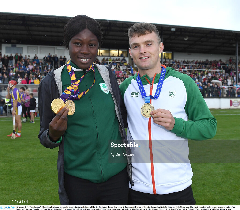 13 August 2019; Team Ireland's Rhasidat Adeleke and Marcus Lawler during the eighth annual Hurling for Cancer Research, a celebrity hurling match in aid of the Irish Cancer Society in St Conleth’s Park, Newbridge. The event, organised by legendary racehorse trainer Jim Bolger and National Hunt jockey Davy Russell, has raised €830,000 to date to fund the Irish Cancer Society’s innovative cancer research projects. The final score was: Jim Bolger’s Best: 15, Davy Russell’s Stars 15. St Conleth’s Park, Newbridge, Co Kildare. Photo by Matt Browne/Sportsfile