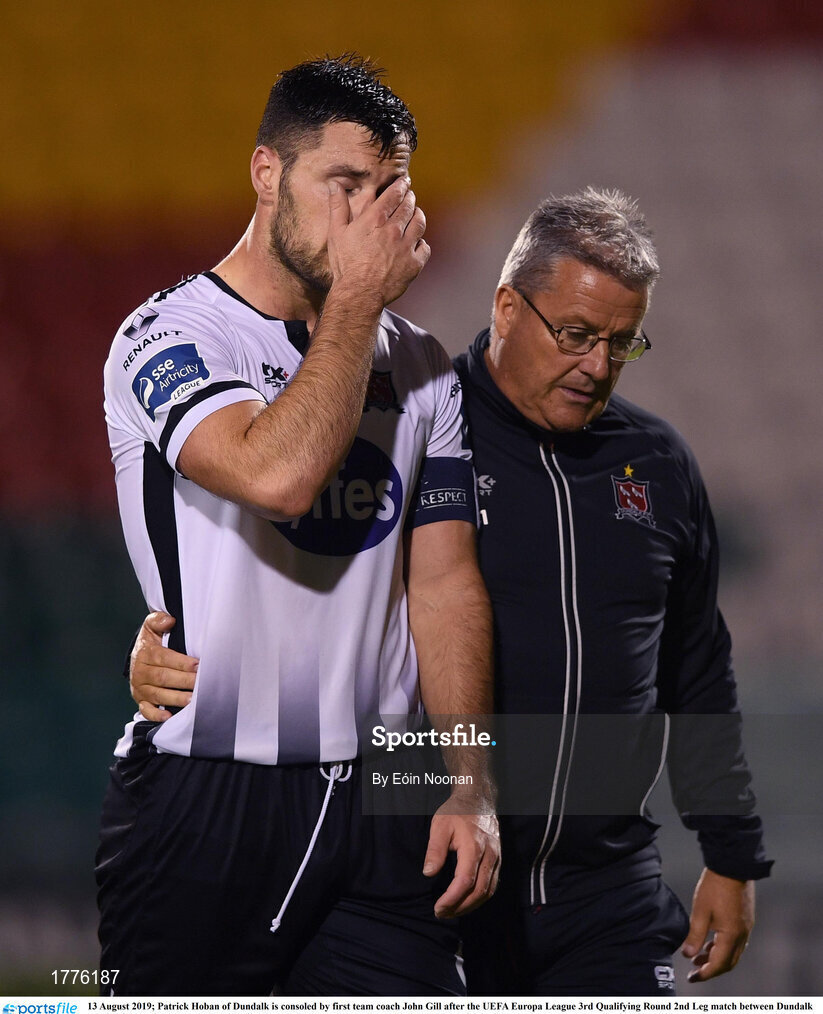 13 August 2019; Patrick Hoban of Dundalk is consoled by first team coach John Gill after the UEFA Europa League 3rd Qualifying Round 2nd Leg match between Dundalk and SK Slovan Bratislava at Tallaght Stadium in Tallaght, Dublin. Photo by Eóin Noonan/Sportsfile