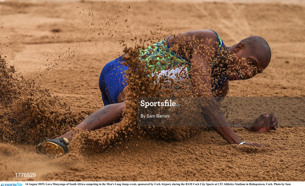 14 August 2019; Luvo Manyonga of South Africa competing in the Men's Long Jump event, sponsored by Cork Airport, during the BAM Cork City Sports at CIT Athletics Stadium in Bishopstown, Cork. Photo by Sam Barnes/Sportsfile