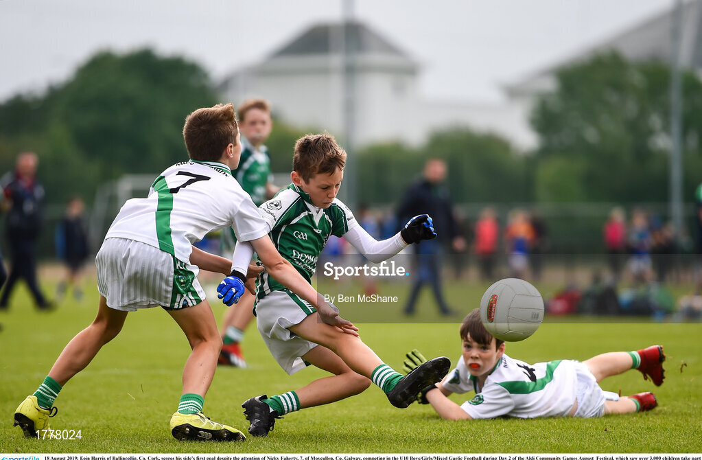 18 August 2019; Eoin Harris of Ballincollig, Co. Cork, scores his side's first goal despite the attention of Nicky Faherty, 7, of Moycullen, Co. Galway, competing in the U10 Boys/Girls/Mixed Gaelic Football during Day 2 of the Aldi Community Games August Festival, which saw over 3,000 children take part in a fun-filled weekend at UL Sports Arena in University of Limerick, Limerick. Photo by Ben McShane/Sportsfile