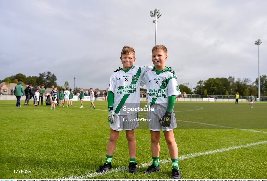 18 August 2019; Oisin, right, and Fiach Silke of Moycullen, Co. Galway, sons of manager and former Galway Senior Footballer, Ray, pose for a photo prior to competing in the Boys/Girls/Mixed U10 Gaelic Football during Day 2 of the Aldi Community Games August Festival, which saw over 3,000 children take part in a fun-filled weekend at UL Sports Arena in University of Limerick, Limerick. Photo by Ben McShane/Sportsfile