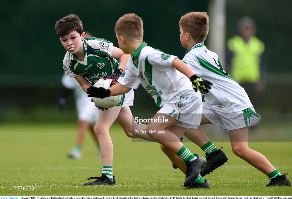 18 August 2019; Evan Stack of Ballincollig, Co. Cork, is tackled by Oisin, centre, and Fiach Silke of Moycullen, Co. Galway, during the Boys/Girls/Mixed U10 Gaelic Football during Day 2 of the Aldi Community Games August Festival, which saw over 3,000 children take part in a fun-filled weekend at UL Sports Arena in University of Limerick, Limerick. Photo by Ben McShane/Sportsfile