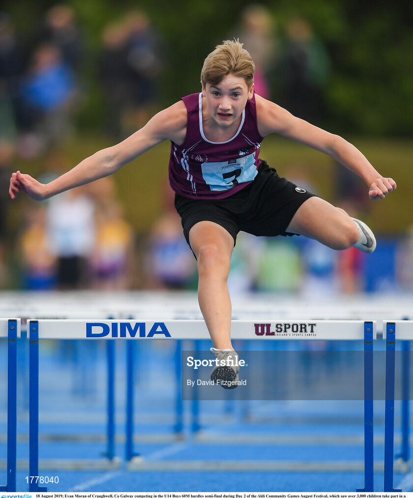 18 August 2019; Evan Moran of Craughwell, Co Galway competing in the U14 Boys 60M hurdles semi-final during Day 2 of the Aldi Community Games August Festival, which saw over 3,000 children take part in a fun-filled weekend at UL Sports Arena in University of Limerick, Limerick. Photo by David Fitzgerald/Sportsfile