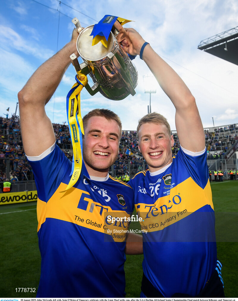 18 August 2019; John McGrath, left with, Brian McGrath of Tipperary celebrate with the Liam MacCarthy cup, after the GAA Hurling All-Ireland Senior Championship Final match between Kilkenny and Tipperary at Croke Park in Dublin. Photo by Stephen McCarthy/Sportsfile