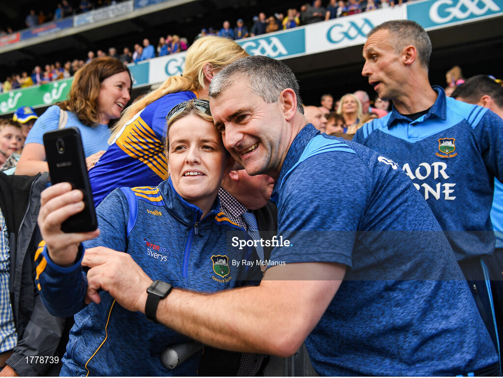 18 August 2019; Eimear Tyrell from Toomevara with Tipperary manager Liam Sheedy after the GAA Hurling All-Ireland Senior Championship Final match between Kilkenny and Tipperary at Croke Park in Dublin. Photo by Ray McManus/Sportsfile
