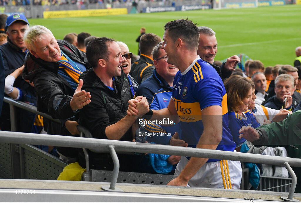18 August 2019; Tipperary captain Séamus Callanan is congratulated by supporters as he walks up the steps to lift the Liam MacCarthy Cup after the GAA Hurling All-Ireland Senior Championship Final match between Kilkenny and Tipperary at Croke Park in Dublin. Photo by Ray McManus/Sportsfile