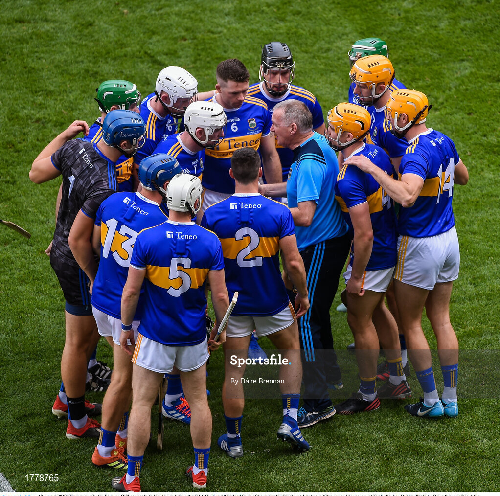 18 August 2019; Tipperary selector Éamonn O'Shea speaks to his players before the GAA Hurling All-Ireland Senior Championship Final match between Kilkenny and Tipperary at Croke Park in Dublin. Photo by Daire Brennan/Sportsfile