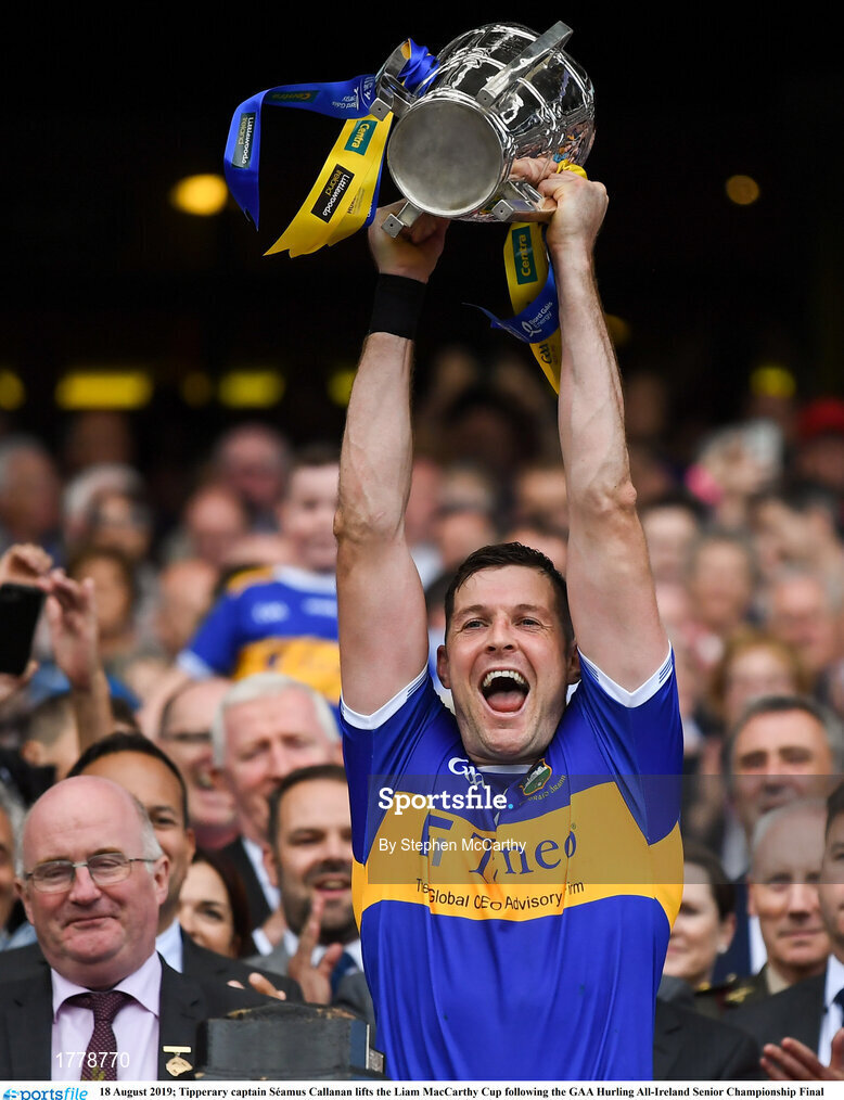 18 August 2019; Tipperary captain Séamus Callanan lifts the Liam MacCarthy Cup following the GAA Hurling All-Ireland Senior Championship Final match between Kilkenny and Tipperary at Croke Park in Dublin. Photo by Stephen McCarthy/Sportsfile