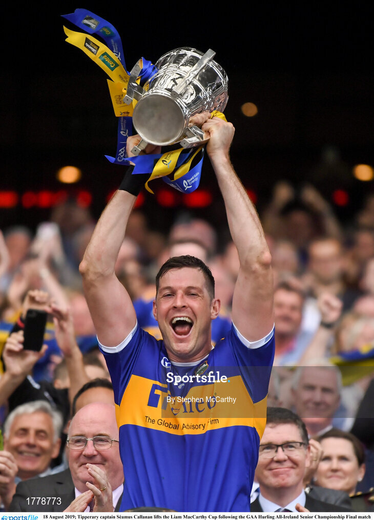 18 August 2019; Tipperary captain Séamus Callanan lifts the Liam MacCarthy Cup following the GAA Hurling All-Ireland Senior Championship Final match between Kilkenny and Tipperary at Croke Park in Dublin. Photo by Stephen McCarthy/Sportsfile