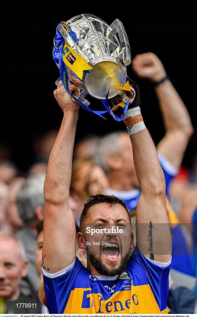 18 August 2019; James Barry of Tipperary lifts the Liam MacCarthy cup following the GAA Hurling All-Ireland Senior Championship Final match between Kilkenny and Tipperary at Croke Park in Dublin. Photo by Seb Daly/Sportsfile