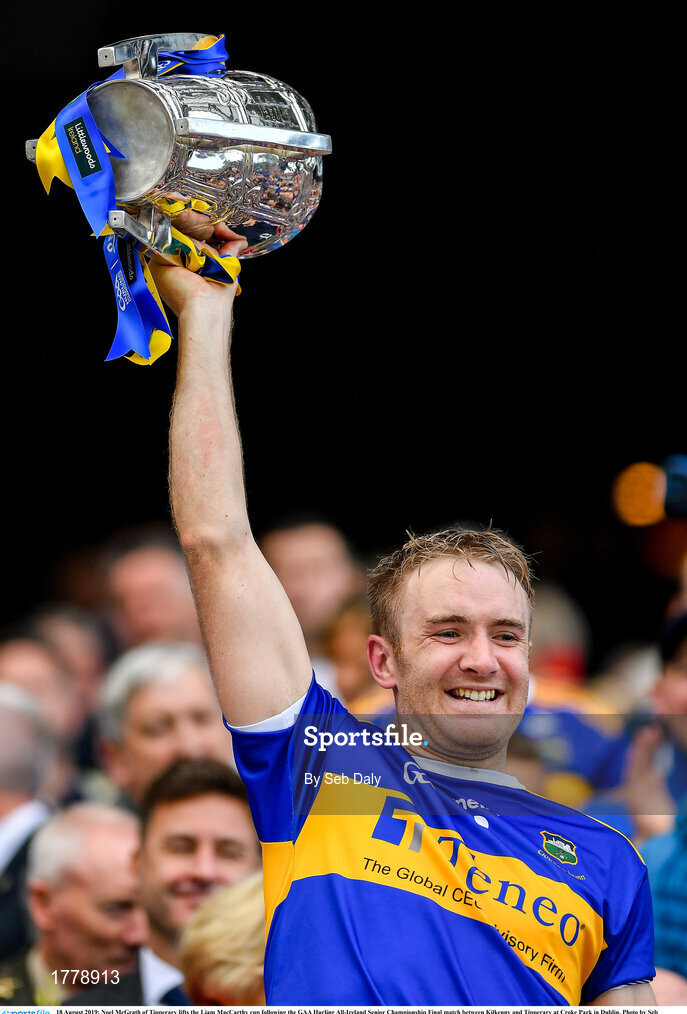18 August 2019; Noel McGrath of Tipperary lifts the Liam MacCarthy cup following the GAA Hurling All-Ireland Senior Championship Final match between Kilkenny and Tipperary at Croke Park in Dublin. Photo by Seb Daly/Sportsfile