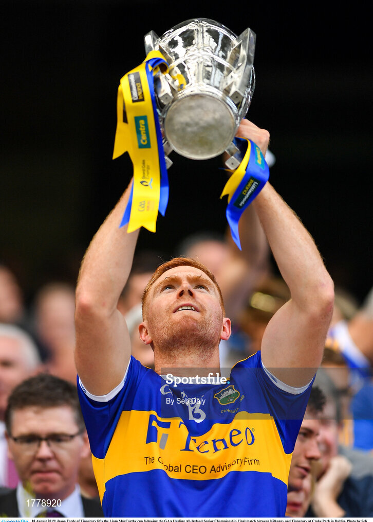 18 August 2019; Jason Forde of Tipperary lifts the Liam MacCarthy cup following the GAA Hurling All-Ireland Senior Championship Final match between Kilkenny and Tipperary at Croke Park in Dublin. Photo by Seb Daly/Sportsfile
