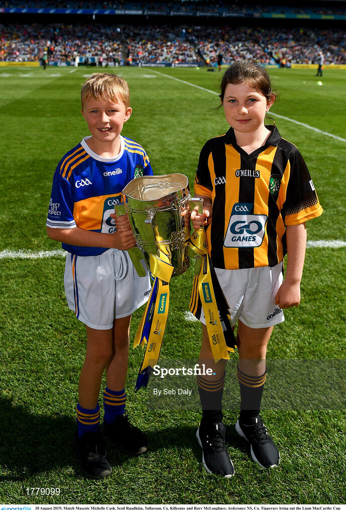 18 August 2019; Match Mascots Michelle Cash, Scoil Ruadháin, Tullaroan, Co. Kilkenny and Rory McLoughney, Ardcroney NS, Co. Tipperary bring out the Liam MacCarthy Cup prior to the GAA Hurling All-Ireland Senior Championship Final match between Kilkenny and Tipperary at Croke Park in Dublin. Photo by Seb Daly/Sportsfile