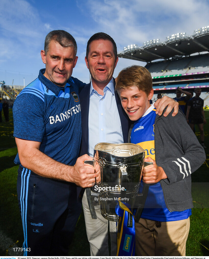 18 August 2019; Tipperary sponsor Declan Kelly, CEO, Teneo, and his son Adrian with manager Liam Sheedy following the GAA Hurling All-Ireland Senior Championship Final match between Kilkenny and Tipperary at Croke Park in Dublin. Photo by Stephen McCarthy/Sportsfile